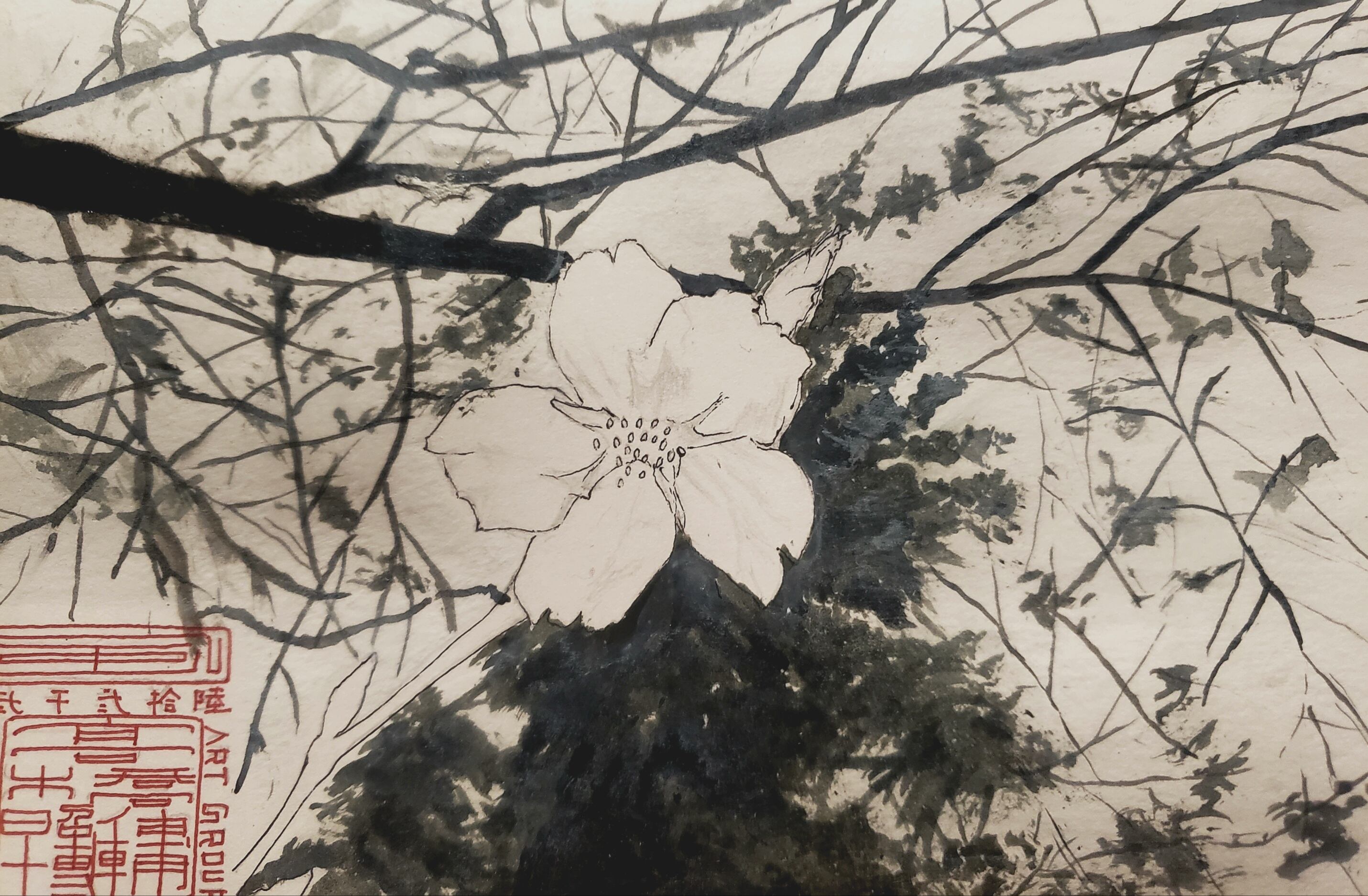 I looked up and saw a single cherry blossom flower blooming with its arms outstretched at the end of the branch.