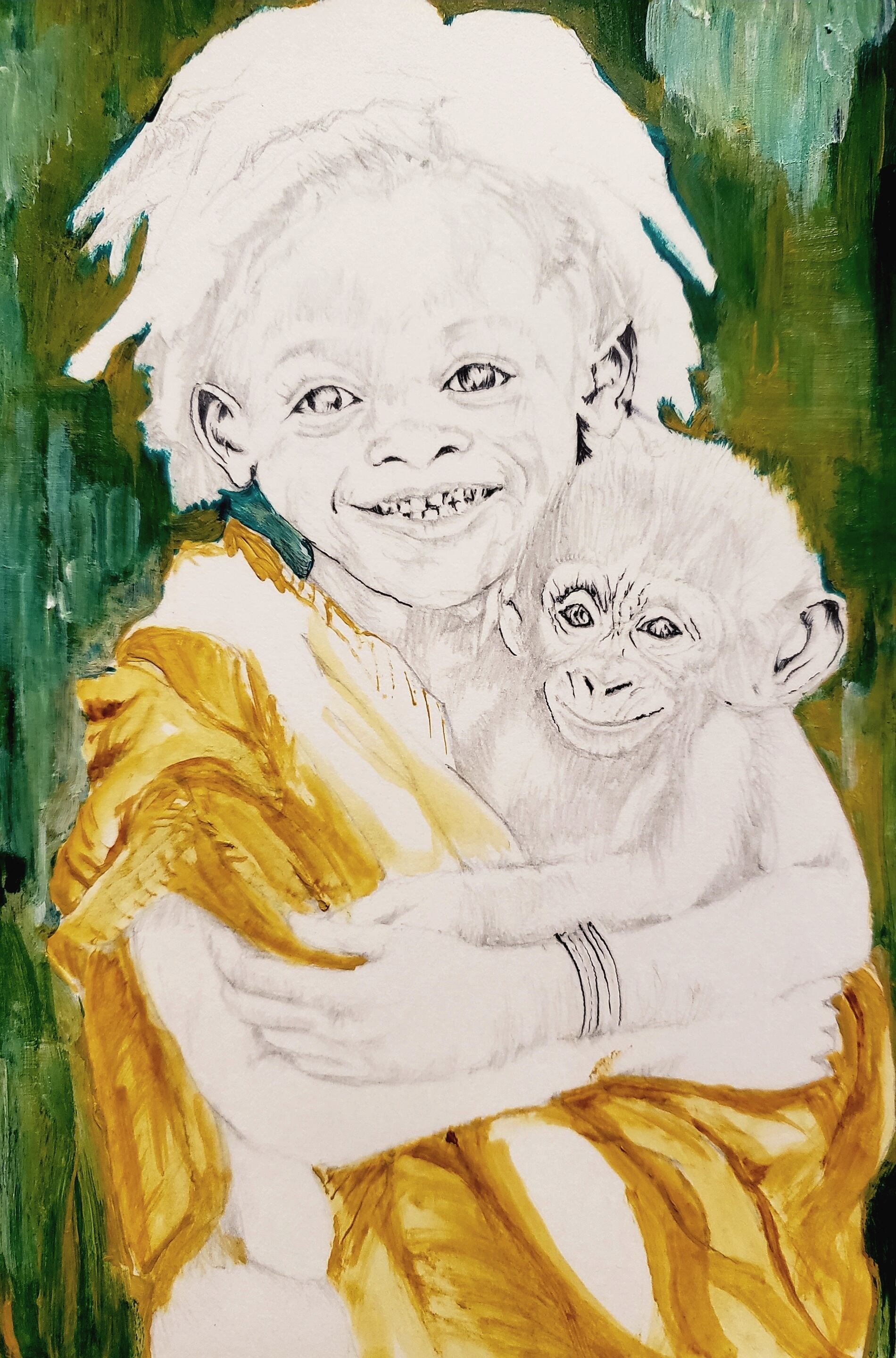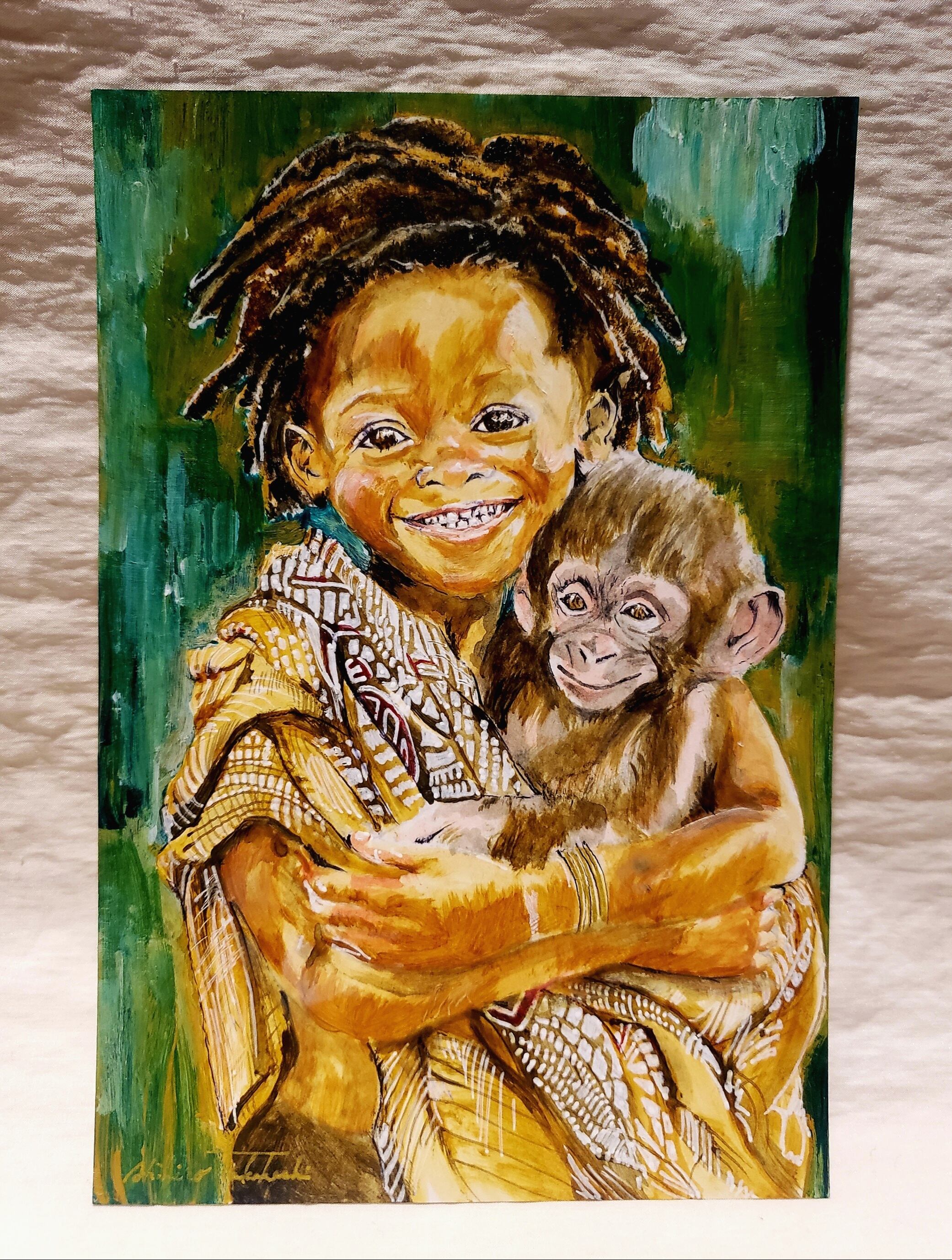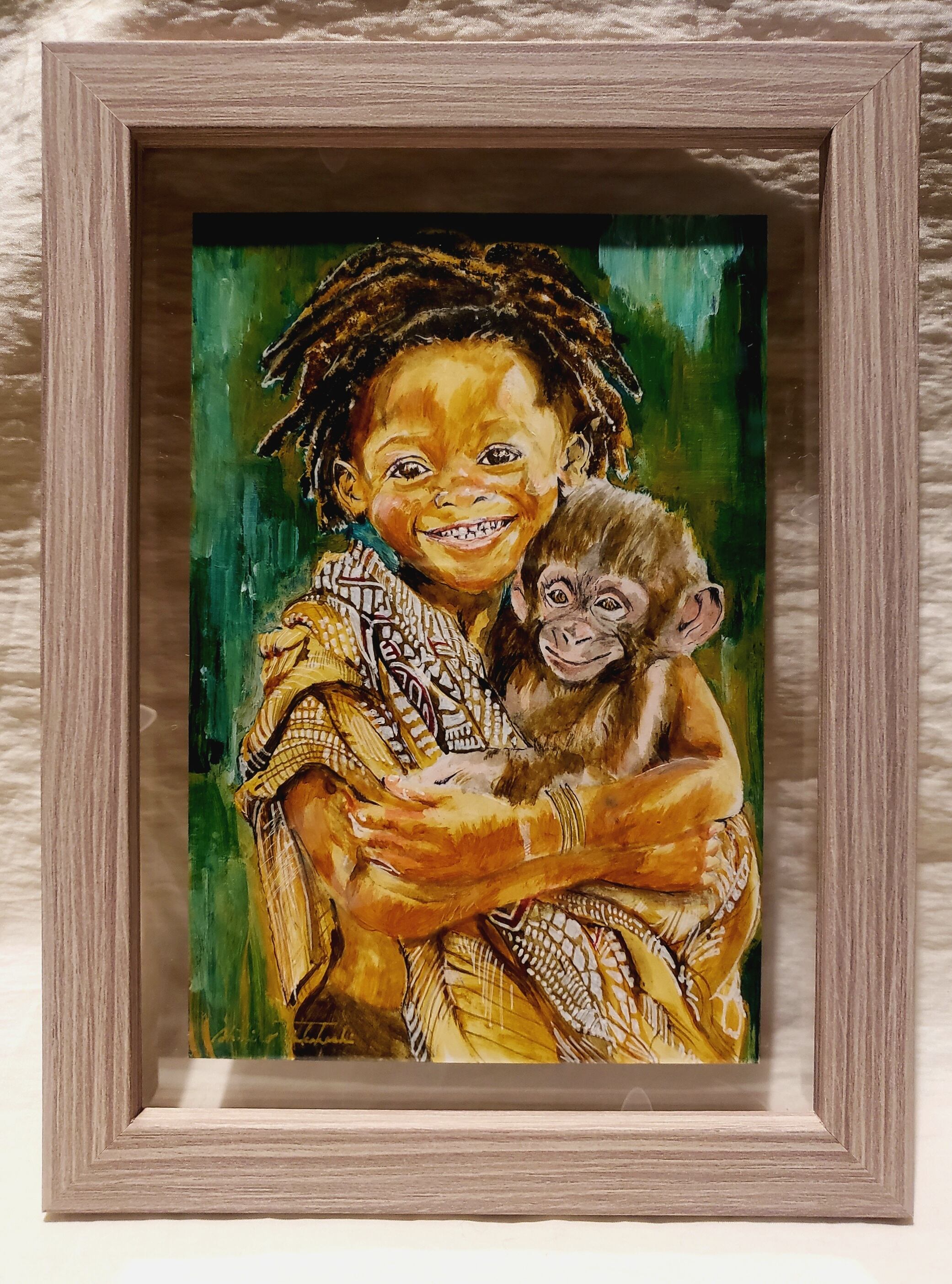 When you look at it, you automatically smile, the smile of the little girl, and the baby chimpanji, still small and innocent, held in the girl's arms and wrapped in warmth. Two small lives that give kindness and smiles.